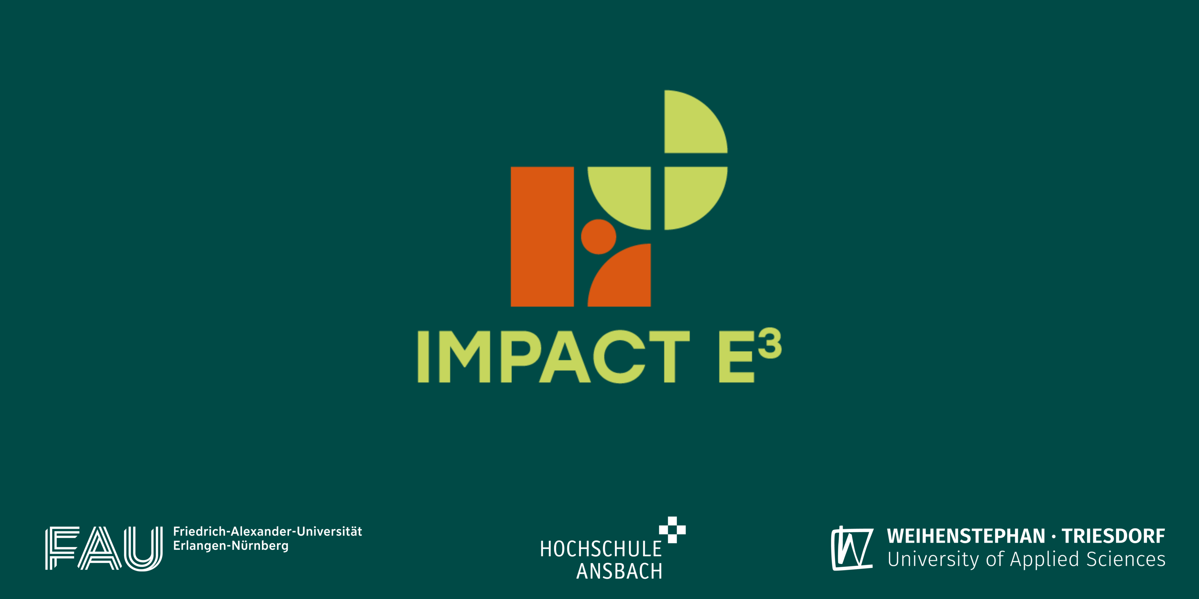 IMPACT E³ ist das Impact Entrepreneurship Qualifizierungsprogramm für Studierende aller Fachbereiche an allen drei Verbundhochschulen der FAU Erlangen-Nürnberg, der Hochschule Ansbach und der Hochschule Weihenstephan-Triesdorf. Ziel des Verbundprojekts ist es, Studierende zu befähigen, innovative Lösungsansätze für gesellschaftliche und ökologische Herausforderungen durch unternehmerisches Denken und Handeln zu entwickeln und umzusetzen.